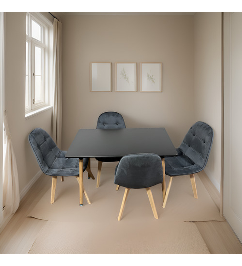 - Comedor 4 Sillas Capitone Felpa Gris + Mesa Nordic Negra 100x60